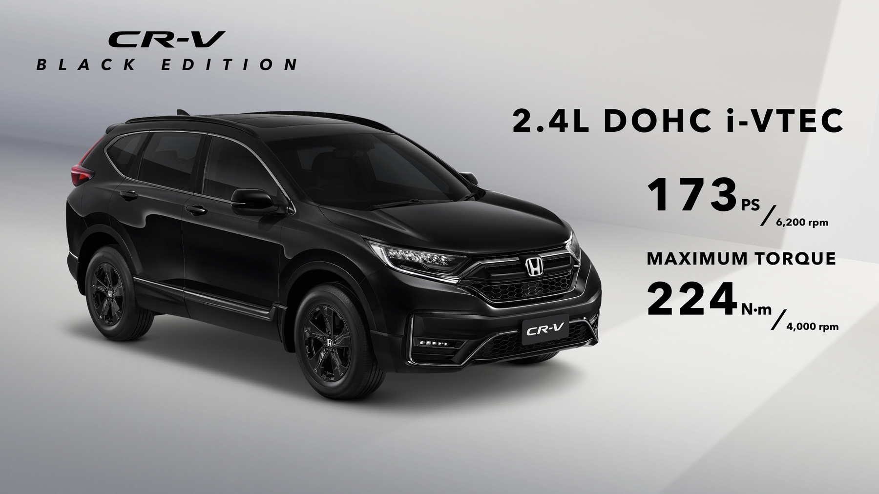 ฮอนด้า ซีอาร์-วี BLACK EDITION ใหม่ มาพร้อมขุมพลังเครื่องยนต์เบนซิน 2.4 ลิตร DOHC i-VTEC 4 สูบ 16 วาล์ว ให้กำลังสูงสุดถึง 173 แรงม้าที่ 6,200 รอบต่อนาที ด้วยแรงบิดสูงสุดที่ 224 นิวตัน-เมตรที่ 4,000 รอบต่อนาที ผสานการทำงานกับเกียร์อัตโนมัติแบบ CVT มอบการตอบสนองที่ทันใจ รองรับพลังงานทางเลือก E85 มาพร้อมระบบขับเคลื่อนสองล้อ (2WD)