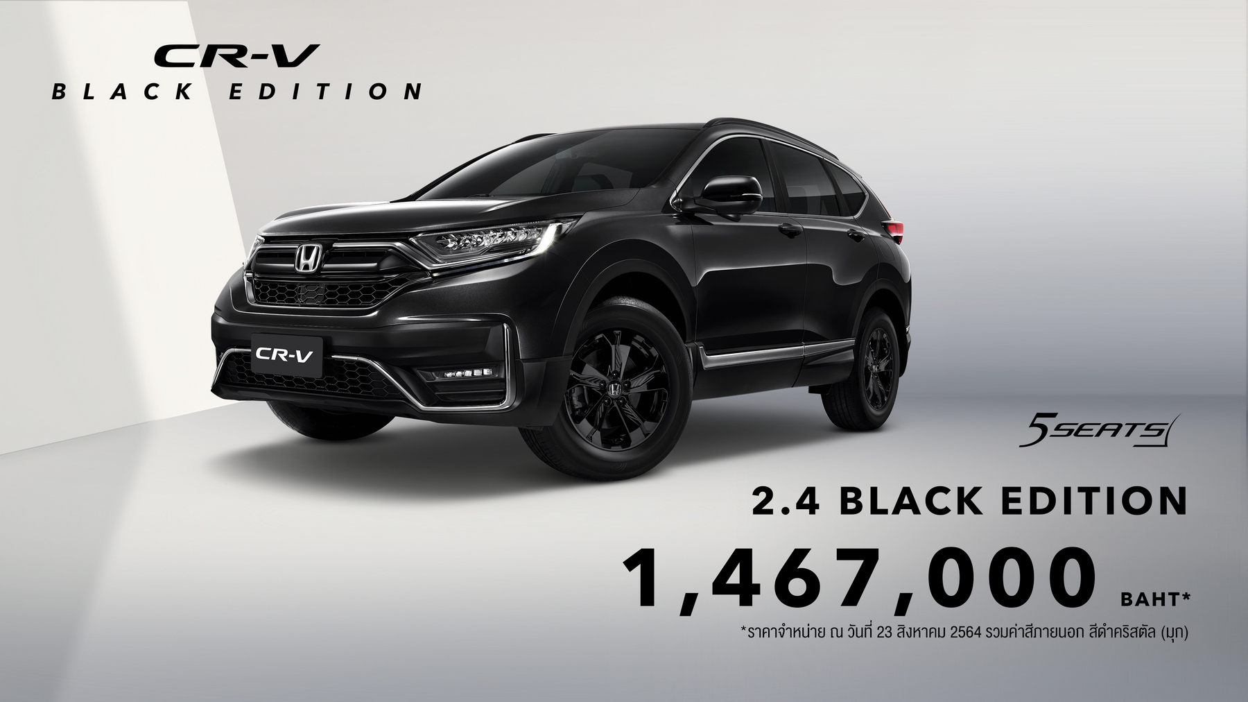 ฮอนด้า ซีอาร์-วี รุ่น 2.4 BLACK EDITION ใหม่ ราคา 1,467,000 บาท รวมค่าสีภายนอก สีดำคริสตัล (มุก) มาพร้อมข้อเสนอพิเศษเพื่อให้ลูกค้าเป็นเจ้าของรถยนต์ได้ง่ายขึ้น สำหรับลูกค้าที่จองและรับรถยนต์ ตั้งแต่วันที่ 23 สิงหาคม 2564 – 30 กันยายน 2564 รับดอกเบี้ย 1.99% หรือเลือกรับข้อเสนอ Double Smile ดาวน์ 0 บาท หรือผ่อนเริ่มต้นเพียงเดือนละ 20,000 บาท