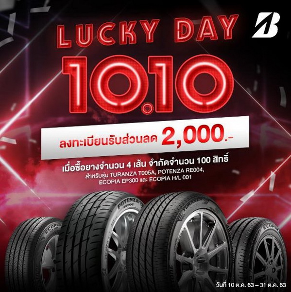 บริดจสโตน เอาใจลูกค้าต่อเนื่อง ส่งแคมเปญ “LUCKY DAY 10.10” มอบส่วนลด 2,000 บาท สำหรับยางรถยนต์นั่งรุ่นยอดนิยม
