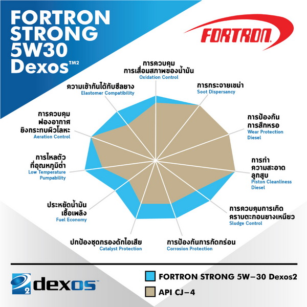 FORTRON STRONG D LONG LIFE PERFORMANCE 5W-40 น้ำมันเครื่องดีเซลสังเคราะห์แท้ 100% ใหม่จาก FORTRON พร้อมให้การปกป้องเครื่องยนต์จากการสึกหรอทันทีที่สตาร์ท มีชั้นฟิล์มของน้ำมันที่แข็งแกร่งทนทานเป็นพิเศษ ซึ่งจะช่วยเพิ่มประสิทธิภาพในการหล่อลื่น ลดการสึกหรอ ช่วยระบายความร้อน และช่วยชะล้างสิ่งสกปรกได้เป็นอย่างดี ด้วยมาตรฐาน API SN/CF, GM Dexos2 จึงทำให้สามารถรองรับการทำงานของเครื่องยนต์ดีเซล และรถที่มีสรรถนะสูงของคุณได้ดียิ่งขึ้น เหมาะกับรถทุกรุ่นที่ใช้เชื้อเพลิงดีเซล ไบโอดีเซลตั้งแต่ B7 B10 B20 และ B100 รถที่มีสมรรถนะสูงต้องการน้ำมันที่ให้ประสิทธิภาพการหล่อลื่นที่ดี ด้วยการคัดสรรสารเพิ่มคุณภาพระดับพรีเมียม ทำให้ FORTRON STRONG D 5W40 FULLY SYNTHETIC 100% เป็นน้ำมันเครื่องที่มีประสิทธิภาพสูง ช่วยยืดอายุการเปลี่ยนถ่ายน้ำมันเครื่องได้ยาวนานยิ่งขึ้นสูงสุด 20,000 กิโลเมตร
