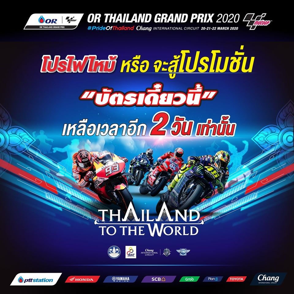 สนามช้างฯ เอาใจเหล่าแฟนพันธุ์แท้โมโตจีพี จัดโปรโมชั่นแบบต่อเนื่อง ในราคาสุดคุ้ม สำหรับ บัตรชมโมโตจีพี 2020 สนามที่ 2 รายการ OR Thailand Grand Prix เหลือเวลาเพียงสองวัน หากซื้อบัตรภายในวันที่ 5 ม.ค.นี้ !! รับสิทธิ์ส่วนลดพิเศษมากมาย ซื้อบัตรได้ที่ ร้าน 7-Eleven ทั่วประเทศ และ www.allticket.com