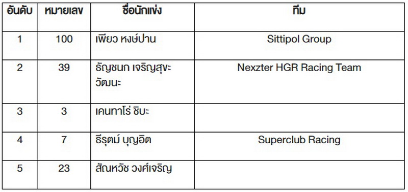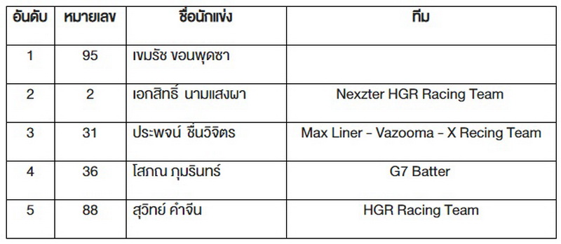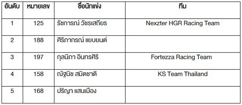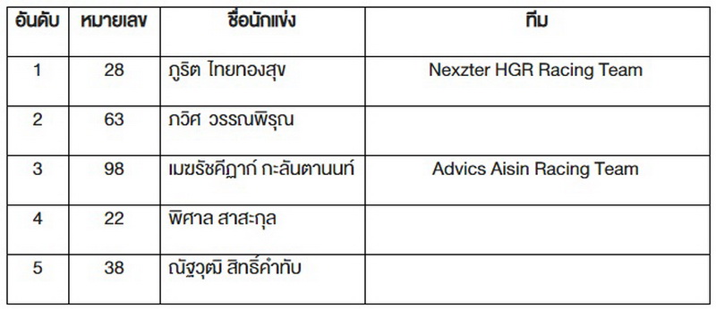 แชมป์สนามนี้ ตกเป็นของ “ภูริต ไทยทองสุข” หมายเลข 28 จากทีม Nexzter HGR Racing Team ในขณะที่อันดับ 2 ตกเป็นของ “ภวิศ วรรณพิรุณ” หมายเลข 63 และ อันดับที่ 3 ตกเป็นของ “เมฆรัชคีฏาก์ กะลันตานนท์” หมายเลข 98 จากทีม Advics Aisin Racing Team