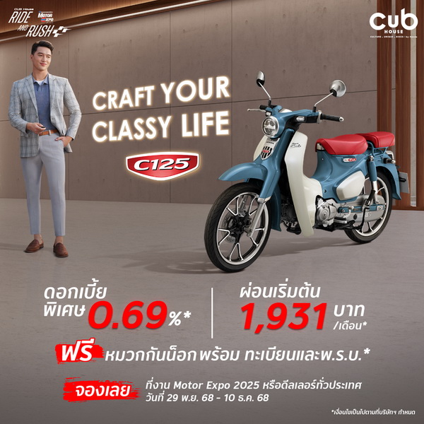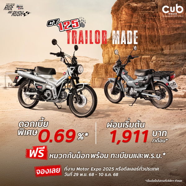 CUB House by Honda เชิญชวนสาวกรถจักรยานยนต์สไตล์คัสตอมร่วมสัมผัสความพิเศษด้วยโปรโมชันสุดคุ้มในงานมหกรรมยานยนต์ ครั้งที่ 42 (Thailand International Motor Expo 2025) สำหรับผู้ที่ต้องการเป็นเจ้าของรถจักรยานยนต์ CUB House ไม่ว่าจะเป็น Honda Dax, Honda Monkey, Honda C125 และ Honda CT125 พร้อมสิทธิพิเศษครบชุด ทั้งดอกเบี้ยพิเศษ 0.69%, ผ่อนเริ่มต้นเพียง 1,800 บาทต่อเดือน, และฟรีหมวกกันน็อกพร้อมทะเบียนและ พ.ร.บ.* ตลอดจนสิทธิ์การซื้อชุดแต่ง KITACO Special Sets ในราคาสุดคุ้ม เพื่อให้ผู้ขับขี่ได้อัปเกรดความเท่ในแบบคัสตอมอย่างเต็มสไตล์ CUB House เฉพาะในงานเท่านั้น