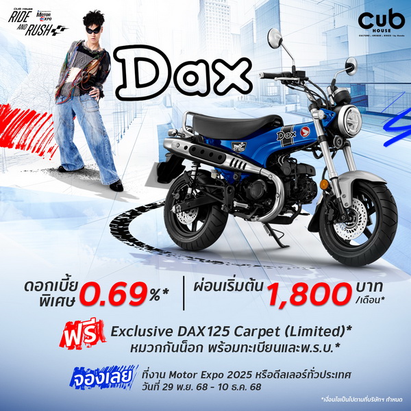 - Dax125 ดอกเบี้ยพิเศษ 0.69%* ผ่อนเริ่มต้นเพียง 1,800 บาท/เดือน* พิเศษ! รับเพิ่ม Exclusive DAX125 Carpet (ของมีจำนวนจำกัด)*