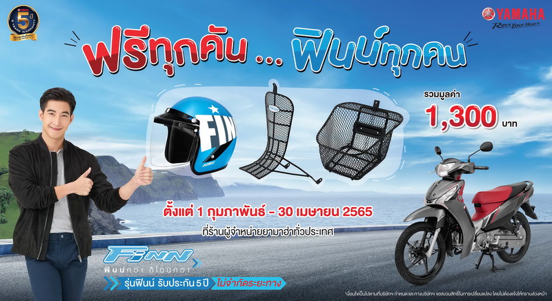 บริษัท ไทยยามาฮ่ามอเตอร์ จำกัด ผู้ผลิตและจำหน่ายรถจักรยานยนต์คุณภาพของเมืองไทย จัดเต็มกับโปรโมชั่นสุดคุ้ม ”ฟรีทุกคัน…ฟินน์ทุกคน” เมื่อซื้อรถจักรยานยนต์ ยามาฮ่า ฟินน์ ระหว่างวันที่ 1 กุมภาพันธ์ – 30 เมษายน 2565 รับของแถมฟรีทันที 3 รายการ รวมมูลค่า 1,300 บาท ได้แก่ 1.หมวกกันน็อก Finn 1 ใบ 2.ตะกร้าหน้า 1 ชิ้น 3.กันลาย 1 ชิ้น พร้อมเพิ่มความมั่นใจในคุณภาพสินค้ากับการรับประกันทั้งคัน 5 ปี ไม่จำกัดระยะทาง กล้าที่จะไป กล้าที่จะเป็น #กล้าที่จะฟินน์