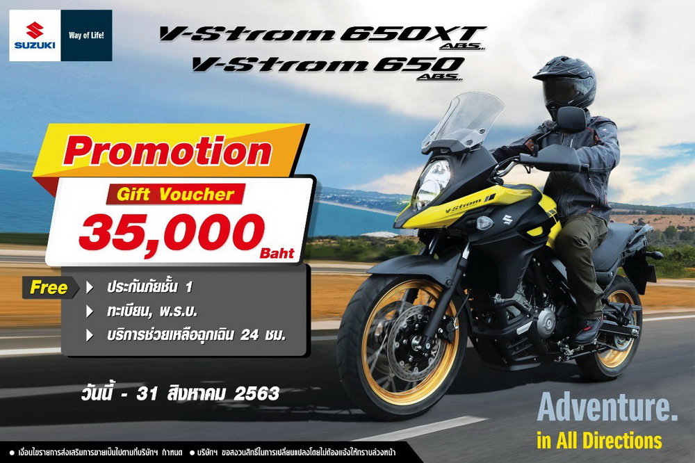 กับความเร้าใจที่การันตีด้วยรางวัล Thailand Bike of The Year 2020 ที่จะมายังคงอัดแน่นไปด้วยเครื่องยนต์แบบ DOHC V-Twin 90 องศา 645 ซีซี ต่อเนื่องด้วยระบบเกียร์ 6 สปีด ระบายความร้อนด้วยน้ำ ระบบจุดระเบิด โดยมีการออกแบบเลือกใช้ 2 หัวเทียน ต่อ 1 สูบ จะช่วยให้การจุดระเบิดทำงานได้อย่างมีประสิทธิภาพมากขึ้น พร้อมติดตั้งระบบ Suzuki Dual Throttle Valve เพื่อให้อากาศไหลผ่านได้เต็มประสิทธิภาพ อีกทั้งระบบ Traction Control 3 ระดับ โดยจะมีการประมวลผลจากเซ็นเซอร์ที่ติดตั้งทั้ง 5 จุด จึงทำให้การควบคุมรถได้อย่างมีประสิทธิภาพ Suzuki V-Strom 650 Series มีให้เลือกถึง 2 รุ่นคือ V-Strom 650XT ล้ออะลูมิเนียมแบบซี่ลวด และรุ่น V-Strom 650 ล้อแม็กอะลูมิเนียมแบบ 10 ก้าน พร้อมยางแบบ Tubeless ที่มีความนุ่มนวลต่อการขับขี่ในทุกสภาพถนน และช่วยซับแรงสั่นสะเทือนได้ดีในทุกการขับขี่ และ Suzuki V-Strom 650 Series มาพร้อมกับโปรโมชั่นพิเศษด้วย Gift Voucher 35,000 บาท