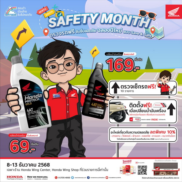 ลูกค้าสามารถเข้ารับบริการได้ตั้งแต่วันนี้ ถึงวันที่ 13 ธันวาคม 2568 ที่ Honda Wing Center และ Honda Wing Shop ที่ร่วมรายการทั่วประเทศ