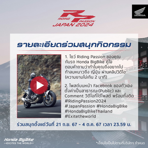 - ใส่แฮชแท็กในแคปชันดังนี้ #RidingPassion2024 #JapanPassion #HondaBigBike #HondaBigBikeThailand #Excitestheworld
