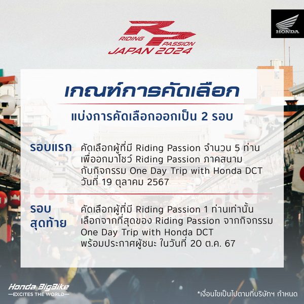 ตรวจสอบรายละเอียดและเงื่อนไขของกิจกรรม Riding Passion Japan 2024 ได้ที่
