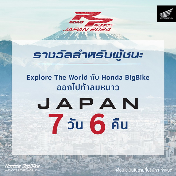 ฮอนด้าบิ๊กไบค์ เปิดโอกาสพิเศษสำหรับลูกค้ากับกิจกรรมทัวร์ริ่ง ‘Riding Passion Japan 2024’ ประเทศญี่ปุ่น ชวนลูกค้าที่มีความหลงใหลในการขับขี่รถจักรยานยนต์มาร่วมแชร์คลิปวิดีโอ Riding Passion เพื่อลุ้นเป็นหนึ่งในผู้ร่วมทริปผจญภัยฤดูหนาวบนเส้นทางธรรมชาติที่ผ่าน 6 เมือง ได้แก่ นาโกย่า เกียวโต กิฟู มัตสึโมโตะ ฟูจิ และชิซุโอกะ ตลอดระยะเวลา 7 วัน 6 คืน ในวันที่ 12-18 และ 18-24 พฤศจิกายน 67