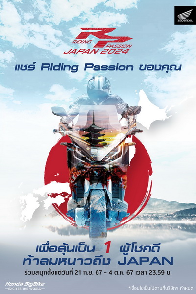 ฮอนด้าบิ๊กไบค์ เปิดโอกาสพิเศษสำหรับลูกค้ากับกิจกรรมทัวร์ริ่ง ‘Riding Passion Japan 2024’ ประเทศญี่ปุ่น ชวนลูกค้าที่มีความหลงใหลในการขับขี่รถจักรยานยนต์มาร่วมแชร์คลิปวิดีโอ Riding Passion เพื่อลุ้นเป็นหนึ่งในผู้ร่วมทริปผจญภัยฤดูหนาวบนเส้นทางธรรมชาติที่ผ่าน 6 เมือง ได้แก่ นาโกย่า เกียวโต กิฟู มัตสึโมโตะ ฟูจิ และชิซุโอกะ ตลอดระยะเวลา 7 วัน 6 คืน ในวันที่ 12-18 และ 18-24 พฤศจิกายน 67