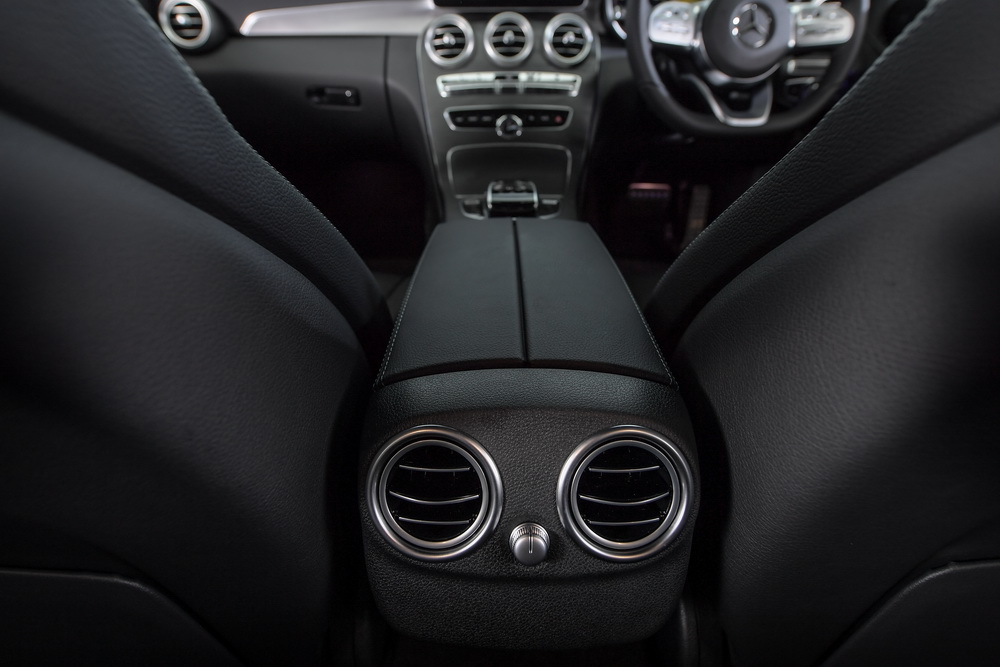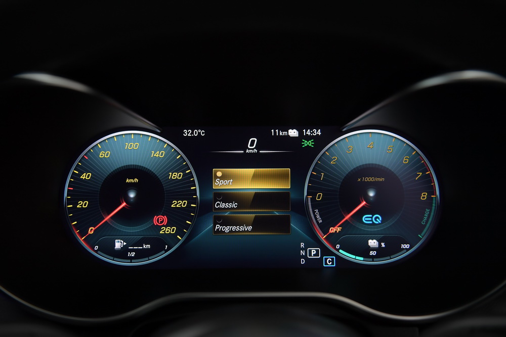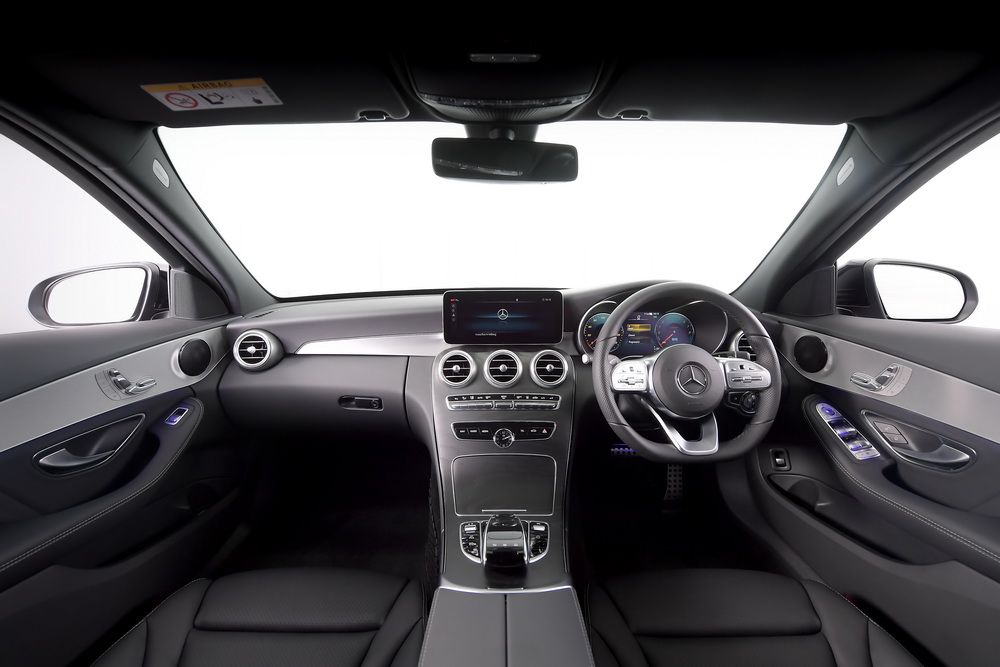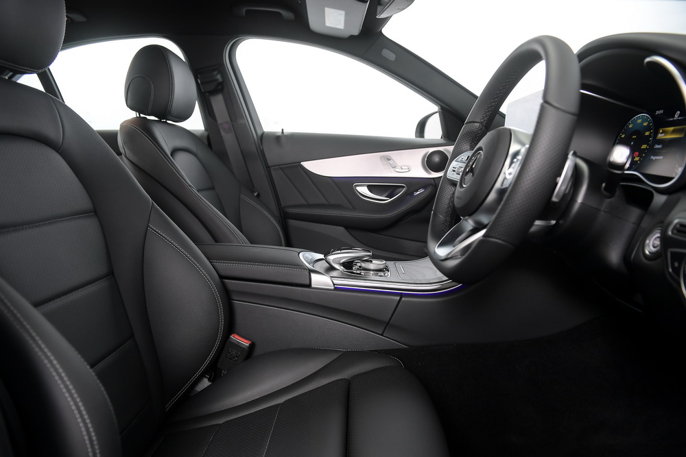 ภายในห้องโดยสารของ Mercedes-Benz C 300 e AMG Sport ได้รับการออกแบบมาเป็นพิเศษเพื่อสะท้อนให้เห็นส่วนผสมอันหรูหราของการนำเสนอความสะดวกสบายและเทคโนโลยีภายใต้ดีไซน์ที่ยอดเยี่ยม เริ่มตั้งแต่วัสดุตกแต่งห้องโดยสารแบบ Open-pore black ash wood และอลูมิเนียม และเบาะนั่งแบบสปอร์ตที่หุ้มด้วยหนัง Artico leather สีดำตัดสลับด้วย DINAMICA Micro-fibre ไปจนถึงแผงหน้าปัดดิจิทัลเต็มรูปแบบพร้อมหน้าจอความละเอียดสูงขนาด 12.3 นิ้ว ที่สามารถปรับเปลี่ยนรูปแบบได้มากถึง 3 สไตล์ ได้แก่ Classic, Sporty และ Progressive โดยยังสามารถปรับเปลี่ยนการแสดงผลได้ตามต้องการ เพื่อลดขั้นตอนการเข้าเมนูและทำให้ผู้ขับขี่ใช้เวลาในการอ่านข้อมูลน้อยลงเพื่อความปลอดภัยที่มากขึ้น