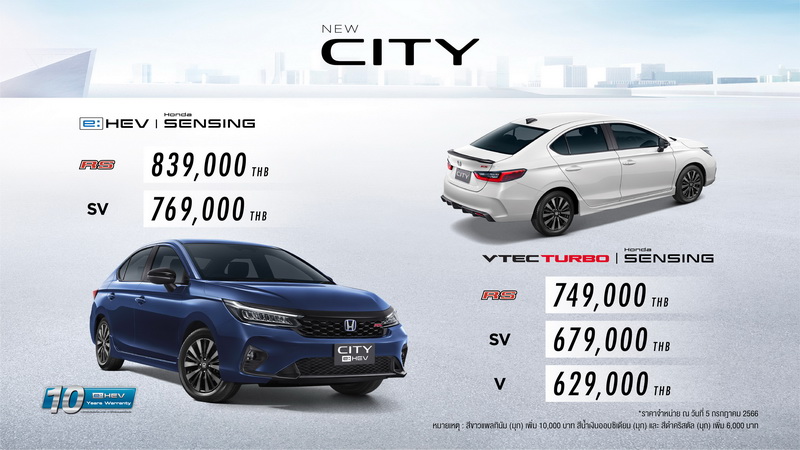 บริษัท ฮอนด้า ออโตโมบิล (ประเทศไทย) จำกัด เปิดตัว ฮอนด้า ซิตี้ ใหม่ ซิตี้คาร์ยอดนิยม คำตอบของความสมบูรณ์แบบในวันนี้ ยกระดับความสปอร์ตยิ่งขึ้นด้วยดีไซน์ใหม่รอบคันโฉบเฉี่ยวในทุกมุมมอง พร้อมฟังก์ชันการใช้งานที่ตอบโจทย์การใช้ชีวิตของคนยุคใหม่ กับขุมพลังฟูลไฮบริด e:HEV ที่ผสานการทำงานอันทรงพลังร่วมกันของมอเตอร์ไฟฟ้า 2 ตัว กับเครื่องยนต์ขนาด 1.5 ลิตร 4 สูบ 16 วาล์ว และแบตเตอรี่ลิเธียม-ไอออน ที่มีประสิทธิภาพสูง ทรงพลัง และให้อัตราการประหยัดน้ำมันดีเยี่ยม 27.8 กิโลเมตร/ลิตร และขุมพลัง VTEC TURBO 1.0 ลิตร ที่มอบกำลังสูงสุด 122 แรงม้า ขับสนุกพร้อมตอบสนองทุกการเดินทาง และประหยัดน้ำมันสูงถึง 23.8 กิโลเมตร/ลิตร มั่นใจทุกการขับขี่กับเทคโนโลยีความปลอดภัยอัจฉริยะ ฮอนด้า เซนส์ซิ่ง (Honda SENSING) ที่ติดตั้งในทุกรุ่นย่อย และเทคโนโลยีเพื่อความสะดวกสบายและความปลอดภัยอื่น ๆ* ที่พร้อมตอบโจทย์ทุกไลฟ์สไตล์ ให้คุณเป็นเจ้าของได้ง่ายขึ้นด้วยข้อเสนอพิเศษ ดอกเบี้ย 2.09%** พร้อมฟรีประกันภัย 1 ปี** และเฉพาะรุ่น e:HEV เพิ่มการรับประกันแบตเตอรี่ไฮบริดเป็น 10 ปี และรับประกันระบบไฮบริดทั้งระบบ 5 ปี ไม่จำกัดระยะทาง** เมื่อจองและรับรถตั้งแต่ 5 กรกฎาคม 2566 – 30 กันยายน 2566** ลูกค้าที่สนใจสามารถพบกับ “ฮอนด้า ซิตี้ ใหม่” ในงานฟาสต์ ออโต โชว์ ไทยแลนด์ แอนด์ อีวี เอ็กซ์โป 2023 ตั้งแต่วันที่ 5 – 9 กรกฎาคม 2566 หรือสัมผัสและทดลองขับได้ที่โชว์รูมฮอนด้าทั่วประเทศตั้งแต่วันที่ 5 กรกฎาคม 2566 เป็นต้นไป