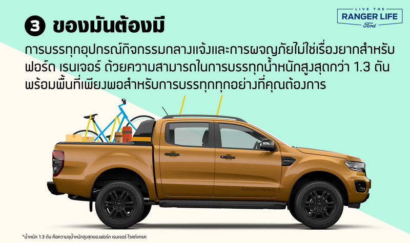 การบรรทุกอุปกรณ์กิจกรรมกลางแจ้งและการผจญภัยไม่ใช่เรื่องยากสำหรับฟอร์ด เรนเจอร์ ด้วยความสามารถในการบรรทุกน้ำหนักสูงสุดกว่า 1.3 ตัน จึงทำให้มีพื้นที่เพียงพอสำหรับการบรรทุกสัมภาระได้อย่างที่คุณต้องการเพื่อการผจญภัยสุดเร้าใจในวันหยุดสุดสัปดาห์ ไม่ว่าจะเป็นอุปกรณ์จักรยานภูเขา เดินเขา แคมปิ้ง หรือแม้กระทั่งวางแผนไปทะเลกับครอบครัวและแก๊งเพื่อน
