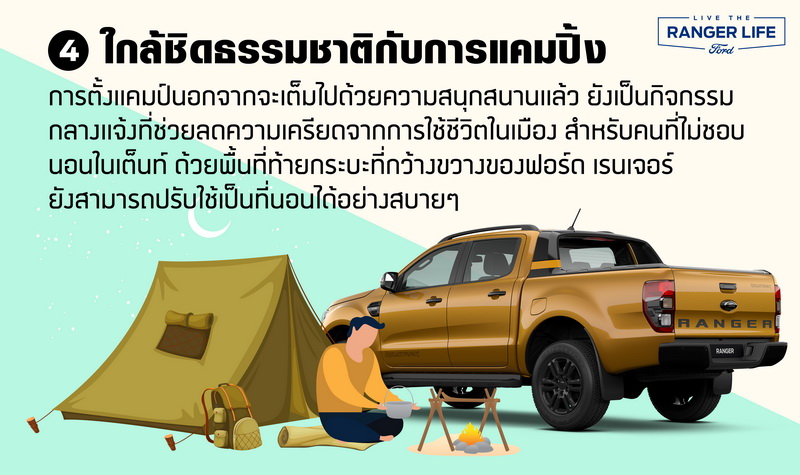 ในช่วงหลายปีที่ผ่านมา เทรนด์การแคมปิ้งกลับมาได้รับความนิยมอีกครั้ง เพราะการตั้งแคมป์นอกจากจะเต็มไปด้วยความสนุกสนาน ได้ใช้เวลากับครอบครัวหรือเพื่อนซี้แล้ว ยังเป็นกิจกรรมกลางแจ้งที่ช่วยลดความเครียดจากการใช้ชีวิตในเมือง ให้ธรรมชาติได้เยียวยาจิตใจ หลายขั้นตอนยังเพิ่มการใช้พลังงานให้เราได้เคลื่อนไหวและออกแรงมากกว่าปกติ เช่น การกางเต็นท์ ก่อกองไฟ สำหรับคนที่ไม่ชอบนอนในเต็นท์ ด้วยพื้นที่ท้ายกระบะที่กว้างขวางของฟอร์ด เรนเจอร์ ยังสามารถปรับใช้เป็นที่นอนได้อย่างสบายๆ
