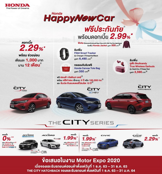 • ฮอนด้า ซิตี้ แฮทช์แบ็ก ใหม่ ยนตรกรรมซิตี้คาร์ในสไตล์สปอร์ตแฮทช์แบ็ก 5 ประตู ที่เปิดตัวครั้งแรกในโลกที่ประเทศไทย ผสานเอกลักษณ์ความอเนกประสงค์กับเบาะนั่ง อัลตราซีท (ULTR) แยกพับแบบ 60:40 ที่ปรับเปลี่ยนเพื่อเพิ่มพื้นที่ใช้สอยอเนกประสงค์ได้ถึง 4 โหมด พร้อมห้องสัมภาระท้ายขนาดใหญ่ อันเป็นเอกลักษณ์ของฮอนด้า และการขับขี่ที่สนุกสนานกับขุมพลังเทอร์โบ เครื่องยนต์ 1.0 ลิตร DOHC VTEC TURBO ให้สมรรถนะการขับขี่สูงถึง 122 แรงม้า แรงบิด 173 นิวตัน-เมตร และประหยัดน้ำมันที่ดีเยี่ยมถึง 23.3 กิโลเมตร/ลิตร มาพร้อมดีไซน์สปอร์ตล้ำสมัย ทั้งภายนอกและภายใน พร้อมยกระดับความสปอร์ตอีกขั้นในรุ่น RS ครบครันด้วยฟังก์ชันที่พร้อมตอบรับทุกไลฟ์สไตล์การใช้งานระดับพรีเมียม และเทคโนโลยีเชื่อมต่อรถยนต์และทำงานผ่านแอปพลิเคชันบนสมาร์ตโฟน Honda CONNECT พร้อมด้วยมาตรฐานความปลอดภัย เพื่อความมั่นใจในทุกการเดินทาง อาทิ กล้องส่องภาพด้านหลังปรับมุมมอง 3 ระดับ ถุงลม 6 ตำแหน่ง เป็นต้น พบกับ ฮอนด้า ซิตี้ แฮทช์แบ็ก ใหม่ ได้ที่โชว์รูมฮอนด้าทั่วประเทศ ตั้งแต่วันที่ 7 มกราคม 2564 เป็นต้นไป โดยลูกค้าสามารถเลือกรับข้อเสนอ “Honda Happy New Car” รับดอกเบี้ยพิเศษ 2.99% มาพร้อมฟรีประกันภัย 1 ปี และรับหูฟัง Skullcandy True Wireless Earbuds รุ่น Sesh Evo สี Deep Red มูลค่า 3,590 บาท และ Honda Jacket มูลค่า 500 บาท หรือข้อเสนอ “Double Smile” ดาวน์เริ่มต้น 0 บาท หรือเลือกผ่อน เริ่มต้นเดือนละ 7,500 บาท เมื่อจองและรับรถยนต์ ตั้งแต่วันที่ 1 ธันวาคม 2563 – 31 มกราคม 2564