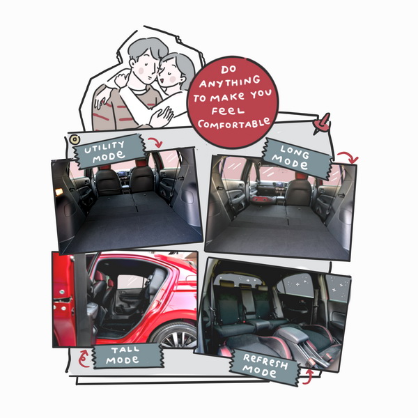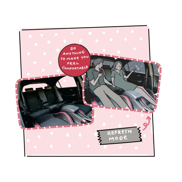 • Refresh Mode: พับเบาะด้านหน้าเชื่อมต่อกับเบาะด้านหลัง เพิ่มพื้นที่ผ่อนคลาย นั่งยืดเหยียดขาพักผ่อนในรถได้แบบชิล ๆ จะนั่งเอนกายงีบหลับสักนิด หรือพิงเบาะหลังดูดาวด้วยกันก็สวีตไปอีกแบบ