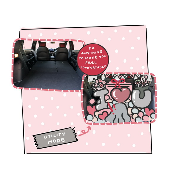 • Utility Mode: พับเบาะด้านหลังทั้ง 2 ด้านได้ราบเรียบ เพิ่มพื้นที่เก็บของด้านหลัง จะวางลูกโป่ง ลูกบอล กล่องของขวัญ ตุ๊กตา หรือจะเตรียมพร็อพทำเซอร์ไพรส์ไว้แน่นแค่ไหน ก็จุได้แบบจัดเต็ม