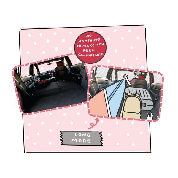 • Long Mode: พับเบาะด้านหน้าและด้านหลัง เพิ่มพื้นที่เก็บของในแนวยาว ตอบโจทย์อย่างยิ่งสำหรับสายเล่นเซิร์ฟ เพราะสามารถใส่เซิร์ฟบอร์ดได้อย่างสบาย ๆ หรือจะใส่อุปกรณ์ตั้งแคมป์แนวยาว ก็เอาอยู่ทุกทริป