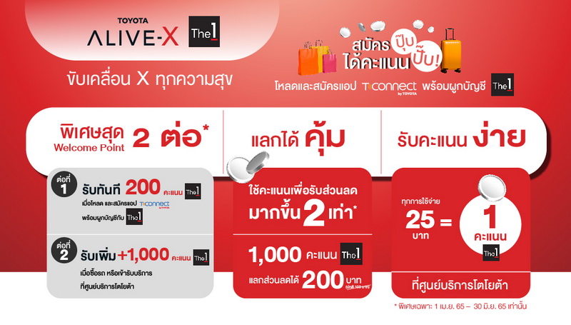 นายสุรศักดิ์ สุทองวัน รองกรรมการผู้จัดการใหญ่ บริษัท โตโยต้า มอเตอร์ ประเทศไทย จำกัดกล่าวเพิ่มเติมว่า “ทั้งนี้ลูกค้าที่เข้าใช้บริการผู้แทนจำหน่ายโตโยต้าทั่วประเทศ สามารถเข้าร่วมโครงการนี้ได้ตั้งแต่วันนี้เป็นต้นไป และที่สำคัญเราขอนำเสนอสิทธิพิเศษในช่วงเปิดตัวลูกค้าจะได้รับ 200 คะแนน จากการสมัครสมาชิก T-Connect และผูกบัญชี The 1 และสำหรับลูกค้าที่ใช้จ่ายที่โชว์รูมหรือศูนย์บริการระหว่างเดือนเมษายน – มิถุนายน นี้ ยังได้รับคะแนนพิเศษอีก 1,000 คะแนน นอกจากนี้ลูกค้าที่มีคะแนน THE ONE CARD ยังสามารถแลกคะแนนสะสมเป็นส่วนลดค่าบริการ ที่ศูนย์บริการโตโยต้าได้ สูงถึง 2 เท่า”