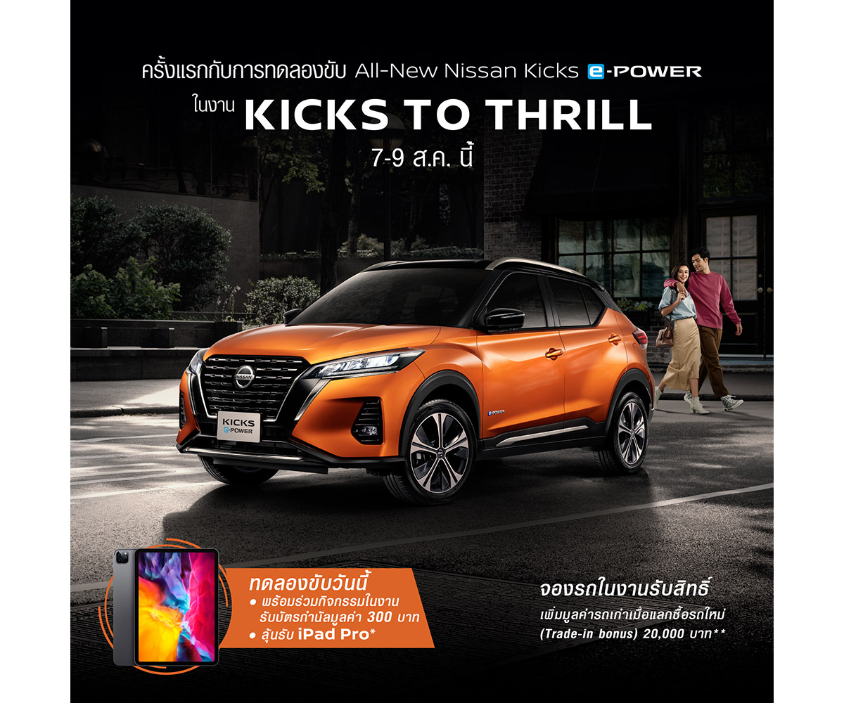 นิสสัน ชวนลูกค้าร่วมสัมผัส นิสสัน คิกส์ อี-พาวเวอร์ ใหม่ ภายในงาน “KICKS to Thrill” ตั้งแต่วันที่ 7 ถึง 9 สิงหาคม 2563 ที่โชว์รูม นิสสัน ทั่วประเทศ โดยภายในงานผู้เข้าร่วมกิจกรรมนอกจากจะได้สัมผัสประสบการณ์รถยนต์ไฟฟ้าและได้ทดลองขับ นิสสัน คิกส์ อี-พาวเวอร์ ใหม่ ยังสามารถร่วมสนุกกับกิจกรรม “ขับ แชะ แชร์” โดยการแชร์รูปถ่ายนิสสัน คิกส์ อี-พาวเวอร์ ใหม่ พร้อมคำบรรยายความประทับใจหลังทดลองขับ รับ E-Voucher บัตรกำนัล เอ็มเค เรสโตรองต์ มูลค่า 300 บาท* และลุ้นรับ iPad Pro จำนวน 10 รางวัล เมื่อตอบแบบสอบถาม Test to Thrill หลังจากทดลองขับ นอกจากนี้ลูกค้าที่จองนิสสัน คิกส์ อี-พาวเวอร์ ใหม่ ภายในงานนี้ รับสิทธิ์ เพิ่มมูลค่ารถเก่าเมื่อแลกซื้อรถใหม่ (Trade-in bonus) มูลค่า 20,000 บาท**