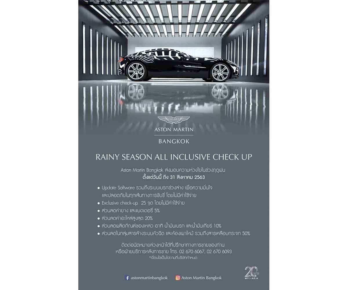 กลุ่มธุรกิจ มาสเตอร์ กรุ๊ป คอร์ปอเรชั่น (เอเชีย) จัดโปรโมชั่นพิเศษ สำหรับเจ้าของยนตรกรรมกลุ่มลักชัวรี่ในเครือฯ ได้แก่ โรลส์-รอยซ์, แอสตัน มาร์ติน และ มาเซราติ เพื่อให้เพิ่มความปลอดภัยและมั่นใจในฤดูฝน กับแคมเปญ ‘Rainy Season All-Inclusive Checkup’ ซึ่งลูกค้าสามารถนำรถเข้ารับบริการ ได้ตั้งแต่วันนี้ ถึง 31 สิงหาคม 2563