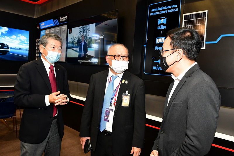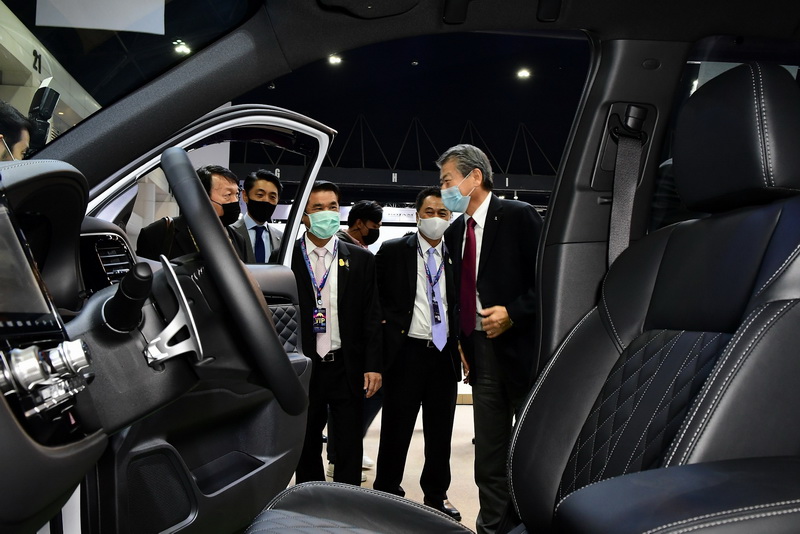 นายสุพัฒนพงษ์ พันธ์มีเชาว์ (ที่ 7 จากขวา) รองนายกรัฐมนตรี และรัฐมนตรีว่าการกระทรวงพลังงาน และนายสุริยะ จึงรุ่งเรืองกิจ (ที่ 6 จากขวา) รัฐมนตรีว่าการกระทรวงอุตสาหกรรม พร้อมด้วย คณะกรรมการนโยบายยานยนต์ไฟฟ้าแห่งชาติ เข้าเยี่ยมชมบูธ มิตซูบิชิ มอเตอร์ส ประเทศไทย ในงานบางกอก อินเตอร์เนชั่นแนล มอเตอร์โชว์ ครั้งที่ 42 ณ ชาเลนเจอร์ ฮอลล์ 1–3 เมืองทองธานี โดยมี มร. โมะริคาซุ ชกกิ (ที่ 7 จากซ้าย) กรรมการผู้จัดการใหญ่ บริษัท มิตซูบิชิ มอเตอร์ส (ประเทศไทย) จำกัด และ มร.เออิอิชิ โคอิโตะ (ที่ 5 จากขวา) กรรมการรองผู้จัดการใหญ่ สายงานขายในประเทศ และบริการหลังการขาย ให้การต้อนรับ พร้อมแนะนำรถยนต์ มิตซูบิชิ เอาท์แลนเดอร์ พีเอชอีวี ซึ่งเป็นรถยนต์พลังงานไฟฟ้าที่เหมาะกับลูกค้าชาวไทยมากที่สุด เพราะนอกจากจะเป็นรถเอสยูวีแบบปลั๊กอินไฮบริดที่มีเทคโนโลยีระบบขับเคลื่อน 4 ล้อ ประสิทธิภาพสูงแล้ว ยังเป็นรถยนต์ที่เป็นมิตรต่อสิ่งแวดล้อม ปล่อยก๊าซคาร์บอนไดออกไซด์ต่ำ สามารถใช้ได้ทั้งพลังงานไฟฟ้าและน้ำมัน ช่วยทำให้รถยนต์สามารถขับได้ระยะทางที่ไกลมากขึ้น โดยไม่ต้องกังวลเรื่องการหาสถานีชาร์จไฟฟ้า นอกจากนี้ คณะผู้บริหารยังได้นำคณะกรรมการฯ เยี่ยมชมนวัตกรรมเทคโนโลยีรถยนต์แบ่งปันพลังงานไฟฟ้ากับ “บ้าน” เรียกว่า “เดนโด ไดร์ฟ เฮ้าส์” อีกด้วย