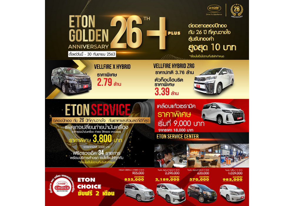 อีตั้น กรุ๊ป ต่อเวลาแคมเปญฉลองความสำเร็จ ‘26th ETON Golden Anniversary +PLUS’ เนื่องในโอกาสครบรอบ 26 ปี พร้อมส่งรถยนต์เอนกประสงค์นำเข้าทุกรุ่น ในราคาที่ดีที่สุด ให้คุณได้มีโอกาสได้เป็นเจ้าของได้ง่ายขึ้น และยังได้ลุ้นรับทองทุกคัน พร้อมรับข้อเสนอสุดพิเศษต่างๆ อีกมากมาย ไม่ว่าจะเป็น
