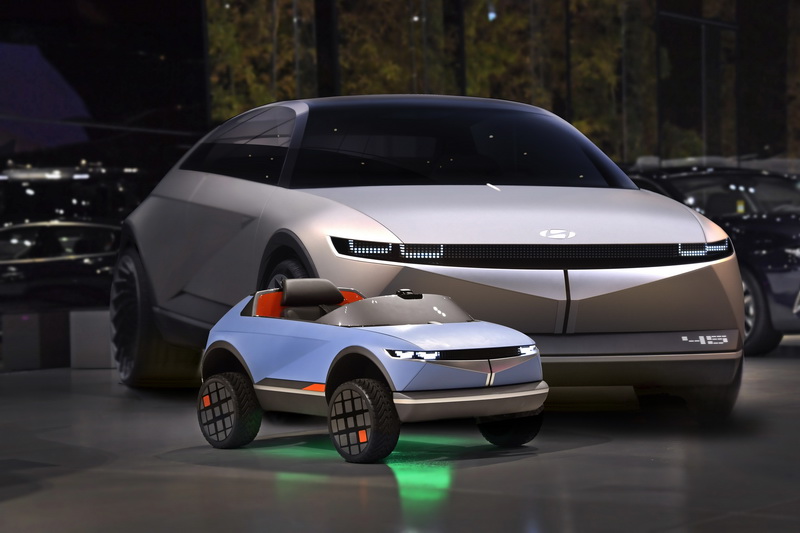รูปลักษณ์ภายนอกของรถยนต์พลังงานไฟฟ้าขนาดจิ๋วพัฒนาจากรถยนต์ต้นแบบ ‘45’ ที่ฮุนไดได้จัดแสดงในงานอินเตอร์ เนชั่นแนล มอเตอร์โชว์ที่แฟรงเฟิร์ต ดีไซน์เนอร์ของฮุนไดได้นำตัวเอกลักษณ์ของไฟที่มีลักษณะเป็นก้อน และการจัดวางมุมที่ลงตัวของรถต้นแบบ ‘45’ มาสร้างสรรค์รถยนต์ไฟฟ้าที่ยังไม่ได้ตั้งชื่อ รวมทั้งยังเน้นให้ดูสปอร์ตด้วยตัวถังสีฟ้าตัดเส้นสีส้มที่โฉบเฉี่ยว
