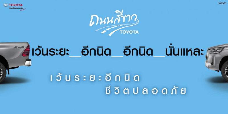 ด้วยความตั้งใจที่จะขับเคลื่อนความสุขและสร้างรอยยิ้มให้กับสังคมไทยอย่างต่อเนื่อง โตโยต้า ขอเชิญชวนทุกคนมามีส่วนร่วมในการรณรงค์ขับขี่ปลอดภัย “เว้นระยะอีกนิด ชีวิตปลอดภัย” โดยเฉพาะช่วงเทศกาลที่มีการใช้รถใช้ถนนมากเป็นพิเศษ เพื่อให้คนไทยทุกคนเดินทางกลับบ้านด้วยความสุขและปลอดภัยในช่วงเทศกาลสงกรานต์