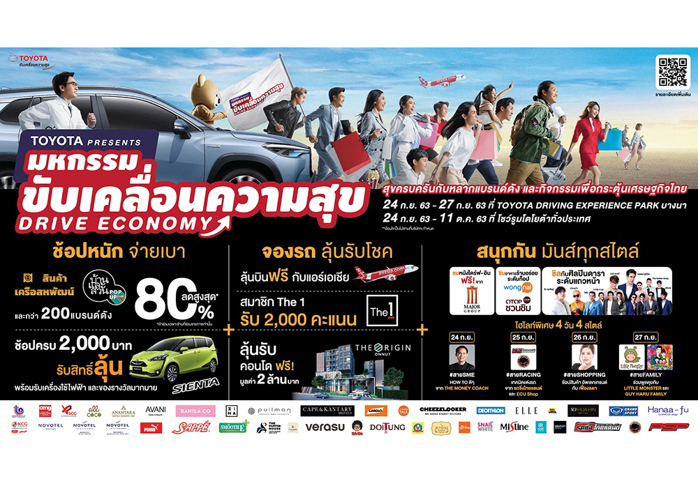 ครั้งแรกแห่งปีกับ งานมหกรรมขับเคลื่อนความสุข Drive Economy โดยโตโยต้า และพันธมิตรทั้งภาครัฐและเอกชน พร้อมรวมทุกมหกรรมงานแฟร์ไว้ในงานเดียว โดยได้ขนทั้งส่วนลด แคมเปญต่างๆ ทัพร้านค้าและแบรนด์ชั้นนำ เข้าร่วมส่งความสุข นำโดย กองทัพรถยนต์โตโยต้า คอนโด ดิ ออริจิ้น สายการบิน Air Asia สินค้าเครือสหพัฒน์ เครือCMG บ้านและสวน เอสซีจี เอ็กซพีเรียนซ์ ไมเนอร์ กรุ๊ป โรงแรมเครือต่างๆ เมเจอร์ ซีนีเพล็กซ์ เครื่องใช้ไฟฟ้า อาทิ ฮิตาชิ กลุ่ม SMEs ที่ได้รับการส่งเสริมจากกรมส่งเสริมอุตสาหกรรม ร้านอาหารยอดนิยมจากวงใน ร้านดังจากโอทอปชวนชิม นอกจากนี้ ภายในงานลูกค้า จะได้พบกับความสนุกสนาน และเพลิดเพลินไปกับมินิคอนเสิร์ตจากศิลปิน ดาราระดับแถวหน้า รวมถึงกูรูที่จะมาให้ความรู้ในด้านต่างๆ พร้อมเต็มอิ่มกับกิจกรรมสุดพิเศษตลอดทั้งงาน ที่ Toyota Driving Experience Park (บางนา กม.3) ระหว่างวันที่ 24 – 27 กันยายน 2563 และตลาดนัดจตุจักร ชลบุรี ระหว่างวันที่ 8 – 11 ตุลาคม 2563