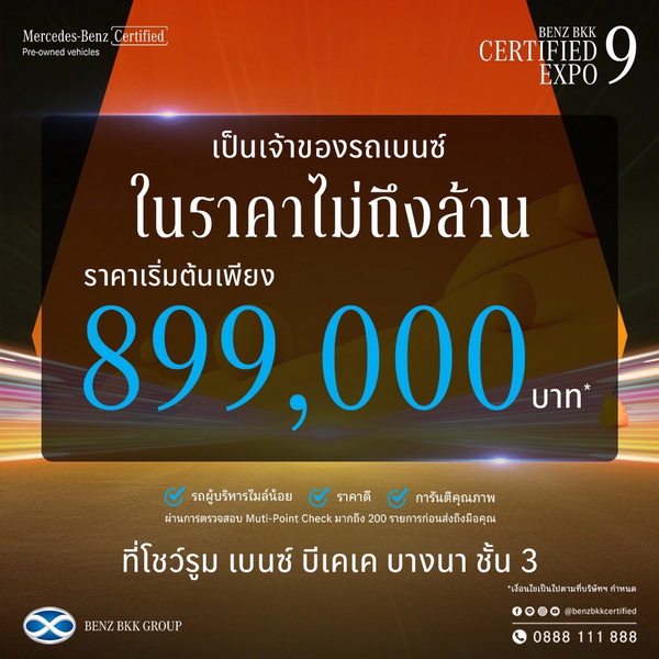 บริษัท เบนซ์ บีเคเค กรุ๊ป จำกัด ผู้จำหน่ายรถยนต์เมอร์เซเดส-เบนซ์และศูนย์บริการอย่างเป็นทางการ พร้อมได้รับสิทธิ์จำหน่ายรถยนต์เมอร์เซเดส-เบนซ์ครบทุกซับแบรนด์ ได้จัดงานมหกรรมสุดยิ่งใหญ่รับศักราชใหม่ BENZ BKK CERTIFIED EXPO ครั้งที่ 9 ที่รวบรวมรถยนต์เสมือนใหม่มากกว่า 100 คัน ทั้งรถผู้บริหารป้ายแดงไมล์น้อย รถทดลองขับ รถมือสอง เพื่อตอบโจทย์ผู้ที่ต้องการครอบครองรถยนต์เมอร์เซเดส-เบนซ์ด้วยความคุ้มค่าสูงสุด โดยสามารถเป็นเจ้าของรถยนต์เมอร์เซเดส-เบนซ์ เริ่มต้นเพียง 899,000 บาท หรือรับอัตราดอกเบี้ยพิเศษเท่ารถใหม่เพียง 0.99% และมั่นใจในรถทุกคันด้วยการรับประกันนาน 1 ปี เมื่อจองรถยนต์ภายในงาน ตั้งแต่วันที่ 19-21 มกราคม และรับรถภายในวันที่ 31 มกราคม 2567 นี้ รับฟรี!! Dyson Pure Cool Link มูลค่า 15,900 บาท นอกจากนี้ เบนซ์ บีเคเค กรุ๊ป พร้อมเดินหน้าสู่การเป็นศูนย์กลางของ Mercedes-Benz Certified