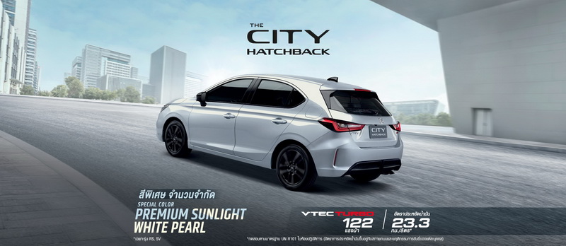บริษัท ฮอนด้า ออโตโมบิล (ประเทศไทย) จำกัด แนะนำ ฮอนด้า ซิตี้ แฮทช์แบ็ก สีใหม่ สีขาวพรีเมียมซันไลท์ (มุก) (Premium Sunlight White Pearl) จำนวนจำกัด เฉพาะรุ่น RS และ SV นำเสนอสีสันใหม่ให้ลูกค้าได้มูฟอย่างมีสไตล์ไปกับซิตี้คาร์สปอร์ตแฮทช์แบ็ก 5 ประตูยอดนิยม ด้วยดีไซน์ภายนอกที่โดดเด่นสไตล์สปอร์ต และเสริมความสปอร์ตแบบเอกซ์คลูซีฟรอบคันในรุ่น RS ภายในกว้างขวาง ผสานเอกลักษณ์ความอเนกประสงค์กับเบาะนั่ง อัลตราซีท (ULTR Seat) ที่สามารถปรับพับเพื่อเปลี่ยนพื้นที่ใช้สอยได้หลากหลายรูปแบบการใช้งาน ขับสนุกอัตราเร่งเร้าใจไปกับขุมพลัง VTEC TURBO 1.0 ลิตร ที่มอบกำลังสูงสุด 122 แรงม้า ที่ 5,500 รอบต่อนาที แรงบิดสูงสุด 173 นิวตัน-เมตร ตั้งแต่ 2,000 – 4,500 รอบต่อนาที และประหยัดน้ำมันดีเยี่ยมถึง 23.3 กิโลเมตร/ลิตร ครบครันด้วยฟังก์ชันเพื่อความสะดวกสบายและความปลอดภัยอื่น ๆ ที่ตอบโจทย์ทุกไลฟ์สไตล์ โดยมาพร้อมข้อเสนอพิเศษ* ดอกเบี้ย 1.85% พร้อมฟรีประกันภัย 1 ปี และรับเพิ่มฟรีโปรแกรมการให้บริการพิเศษด้านคุณภาพรถยนต์ ฮอนด้า อัลติเมท แคร์ (Honda Ultimate Care) ขยายเวลารับประกันคุณภาพอีก 2 ปี หรือ 40,000 กิโลเมตร