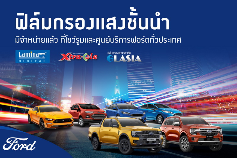 ฟอร์ด ประเทศไทย แนะนําบริการติดตั้งผลิตภัณฑ์ฟิล์มกรองแสงรถยนต์โดยศูนย์บริการฟอร์ด ซึ่งฟอร์ดได้คัดสรรฟิล์มกรองแสงรถยนต์ชั้นนำ 5 รุ่นจาก 3 แบรนด์ระดับโลก ได้แก่ ลามิน่า เอ็กซ์ตร้าโคล และกลาเซีย เพื่อเพิ่มทางเลือกให้ลูกค้าฟอร์ดได้ใช้ฟิล์มกรองแสงคุณภาพสูงมาตรฐานสากล ตอบโจทย์ความต้องการของลูกค้าท่ามกลางสภาพอากาศร้อนในขณะนี้ พร้อมมอบความสบายใจด้วยประกันคุณภาพฟิล์มกรองแสงระยะเวลานานถึง 7 ปี โดยฟิล์มกรองแสงรถยนต์ทั้ง 3 แบรนด์ พร้อมจำหน่ายและติดตั้งที่ศูนย์บริการฟอร์ดทั่วประเทศแล้วตั้งแต่วันนี้