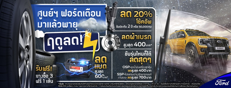 ฟอร์ด ประเทศไทย เปิดตัวแคมเปญรับหน้าฝน ‘ฤดูลด’ มอบข้อเสนอสุดคุ้มด้านบริการมากมายที่คัดสรรมาเพื่อให้ลูกค้าฟอร์ดขับขี่ปลอดภัยและอุ่นใจตลอดช่วงฤดูฝน เพียงนำรถเข้ารับบริการที่ศูนย์บริการฟอร์ดทั่วประเทศตั้งแต่วันนี้ ถึง 31 ตุลาคม 2566