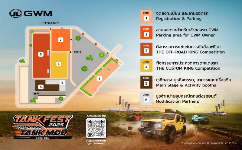 GWM (Thailand) ยกระดับสู่การเป็นแบรนด์รถยนต์ที่มีผลิตภัณฑ์ครอบคลุมทุกประเภทพลังงานที่ตอบสนองความต้องการของผู้ใช้งานทั่วทุกมุมโลก ด้วยแนวคิด “ครอบคลุมทุกการใช้งาน (All Scenarios) ด้วยผลิตภัณฑ์ที่ครอบคลุมทุกพลังงาน (All Powertrains) สู่การตอบสนองทุกกลุ่มผู้ใช้งานอย่างแท้จริง (All Users)” จากความสำเร็จของตระกูลรถออฟโรดทั้ง GWM TANK 300 และ GWM TANK 500 ที่ได้รับการตอบรับอย่างล้นหลามตั้งแต่เปิดตัว สู่จำนวน TANKER หรือผู้ใช้จริงที่เติบโตอย่างก้าวกระโดด เพื่อเป็นการขอบคุณลูกค้าชาวไทยทั่วประเทศและเนื่องในโอกาสเฉลิมฉลองการส่งมอบ NEW GWM TANK 300 DIESEL ครบ 5,000 คัน ปลุกกระแสคนรักรถ GWM TANK และการตกแต่ง รวมถึงเอาใจสายซิ่ง สายลุย และสายโหด GWM จึงจัดมหกรรมเฟสติวัลสุดยิ่งใหญ่ “TANK FEST 2025 and TOP RANK TANK MOD” ครั้งแรกในไทย เนรมิตพื้นที่ขนาดมหึมาเกือบ 50,000 ตารางเมตร ให้เป็นลานกิจกรรมสุดเร้าใจ เปิดพื้นที่สำหรับแฟนพันธุ์แท้ GWM TANK ทั้งสายออฟโรดและสายชิลล์ผู้ที่ชื่นชอบการแต่งรถให้เป็นพื้นที่ได้ปล่อยของ ปลดปล่อยจินตนาการ และความคิดสร้างสรรค์ได้อย่างไร้ขีดจำกัด ผ่านกิจกรรมความสนุกที่อัดแน่นในทุกตารางนิ้ว ทั้งเวทีประกวดและจัดแสดงรถแต่ง การแข่งขันการขับขี่ออฟโรดสุดครีเอทีฟ สนามเทสต์สมรรถนะ GWM TANK กิจกรรมความสนุกอีกมากมาย พร้อมรับของที่ระลึกติดไม้ติดมือกลับบ้าน การันตีความอร่อยตลอดวันด้วยสตรีทฟู้ดกับ Food truck เจ้าดังจำนวนมาก รับชมการแสดงดนตรีคลอเคล้าบรรยากาศจากวงดนตรีชื่อดังตั้งแต่เช้าจรดเย็น พร้อมตบท้ายด้วยคอนเสิร์ตจากศิลปินชื่อดังยามค่ำคืน สำหรับผู้ที่สนใจทุกคนเข้าร่วมงานฟรีแบบไม่มีค่าใช้จ่าย จะมาคนเดียว มาเป็นคู่ เป็นแก๊งค์ หรือยกขบวนทั้งครอบครัว ปักหมุดแล้วมาเจอกัน วันเสาร์ที่ 18 ตุลาคม 2568 ณ ESC Park รังสิต จ.ปทุมธานี และวันอาทิตย์ที่ 19 ตุลาคม 2568 สำหรับผู้ที่สนใจทดลองขับ GWM