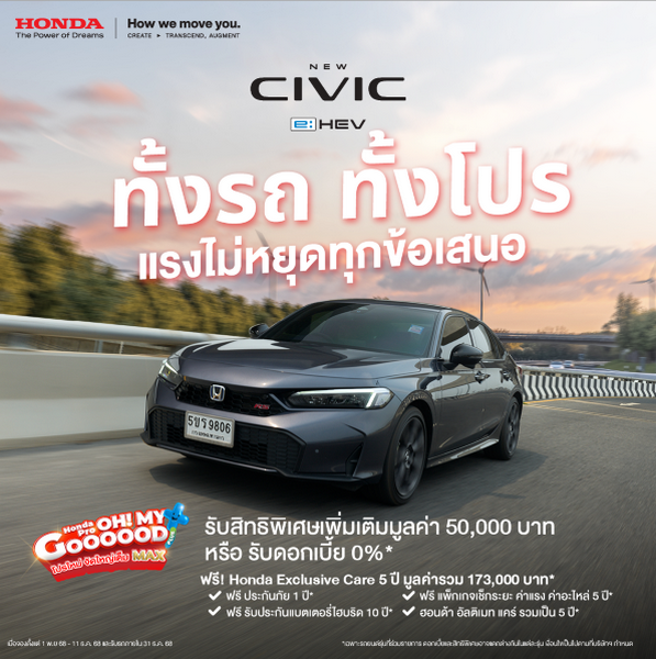 บริษัท ฮอนด้า ออโตโมบิล (ประเทศไทย) จำกัด จัดโปรแรงส่งท้ายปีกับแคมเปญ “Honda Pro OH! MY GOOOOOD PLUS+” เพิ่มเติมทางเลือกใหม่สำหรับรถยนต์สองรุ่นฮิตในไลน์อัป Honda e:HEV – The EXCITING Hybrid ทั้ง Honda Civic e:HEV และ New Honda HR-V e:HEV มอบความคุ้มค่าที่ “ตรงใจ เลือกได้เอง” ให้คุณเลือกได้ดั่งใจรับสิทธิพิเศษเพิ่มเติมมูลค่า 50,000 บาท หรือ เลือกรับดอกเบี้ยพิเศษ 0% พร้อมรับ Honda Exclusive Care 5 ปี มูลค่าสูงสุด 173,000 บาท** ให้การเป็นเจ้าของรถยนต์ทั้งสองรุ่นเป็นเรื่องง่ายกว่าที่เคย สำหรับลูกค้าที่จองรถยนต์ตั้งแต่วันที่ 1 พฤศจิกายน 2568 – 11 ธันวาคม 2568 และรับรถภายในวันที่ 31 ธันวาคม 2568 อย่าพลาด! โปรแรงแห่งปีที่ทำให้ความฝันของคุณเป็นจริง