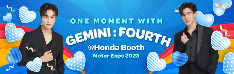 พิเศษ ในวันเสาร์ที่ 9 ธันวาคม 2566 เวลา 16.30 – 17.30 น. เอาใจชาวด้อมคุณหนูกับกิจกรรม “One Moment with Gemini – Fourth” กับ 2 นักแสดงหนุ่มสุดฮอต “เจมีไนน์ – นรวิชญ์ ฐิติเจริญรักษ์” และ “โฟร์ท – ณัฐวรรธน์ จิโรชน์ธิกุล” พร้อมร่วมกิจกรรมทายใจ เจมีไนน์ – โฟร์ท เพื่อลุ้นรับของที่ระลึกสุดเอ็กซ์คลูซีฟที่บูทฮอนด้า