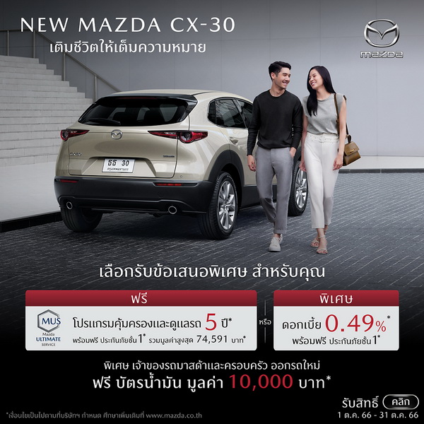 - Mazda CX-30 และ Mazda CX-30 CARBON EDITION: ดอกเบี้ย 1.59%1, ฟรีประกันภัยชั้นหนึ่ง Mazda Premium Insurance 1 ปี2, ฟรีโปรแกรมคุ้มครองและดูแลรถ 5 ปี Mazda Ultimate Service (MUS)4 หรือ ดอกเบี้ย 0.49%1, ฟรีประกันภัยชั้นหนึ่ง Mazda Premium Insurance 1 ปี2