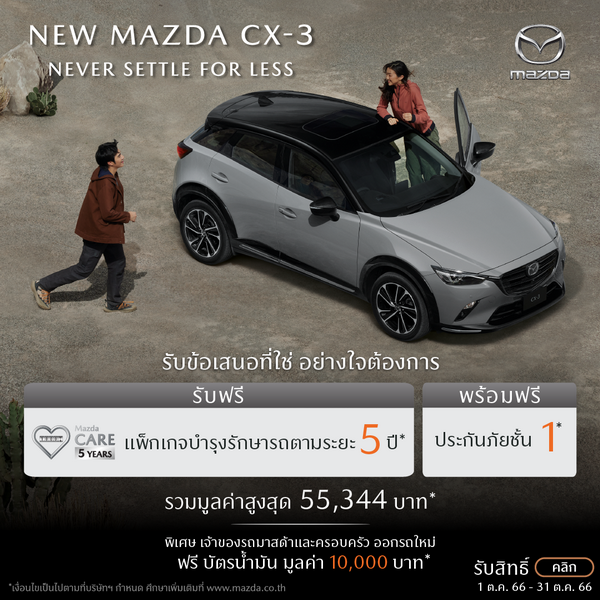 - New Mazda CX-3: ดอกเบี้ย 39%1, ฟรีประกันภัยชั้นหนึ่ง Mazda Premium Insurance 1 ปี2, ฟรีแพ็กเกจบำรุงรักษารถตามระยะ Mazda Care 5 ปี (รวมค่าแรง ค่าอะไหล่ และของเหลว)³ หรือ ดอกเบี้ย 1.19%1, ฟรีประกันภัยชั้นหนึ่ง Mazda Premium Insurance 1 ปี2