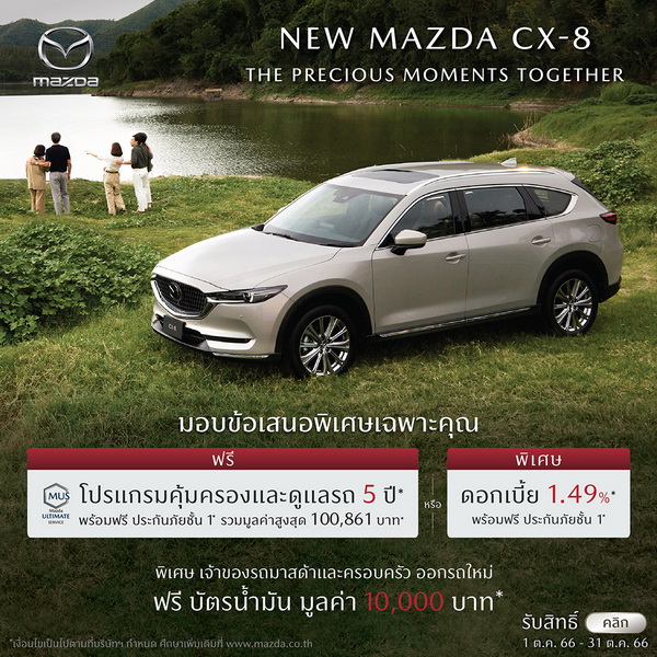 - Mazda CX-8: ดอกเบี้ย 39%1, ฟรีประกันภัยชั้นหนึ่ง Mazda Premium Insurance 1 ปี2, ฟรีโปรแกรมคุ้มครองและดูแลรถ 5 ปี Mazda Ultimate Service (MUS)4 หรือ ดอกเบี้ย 1.49%1, ฟรีประกันภัยชั้นหนึ่ง Mazda Premium Insurance 1 ปี2
