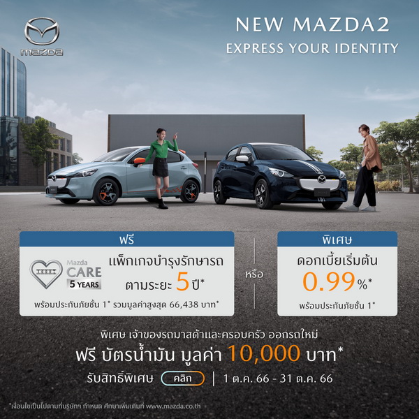 - New Mazda2: ดอกเบี้ย 2.39%1, ฟรีประกันภัยชั้นหนึ่ง Mazda Premium Insurance 1 ปี2, ฟรีแพ็กเกจบำรุงรักษารถตามระยะ Mazda Care 5 ปี (รวมค่าแรง ค่าอะไหล่ และของเหลว)³ หรือ ดอกเบี้ย 0.99%1, ฟรีประกันภัยชั้นหนึ่ง Mazda Premium Insurance 1 ปี2
