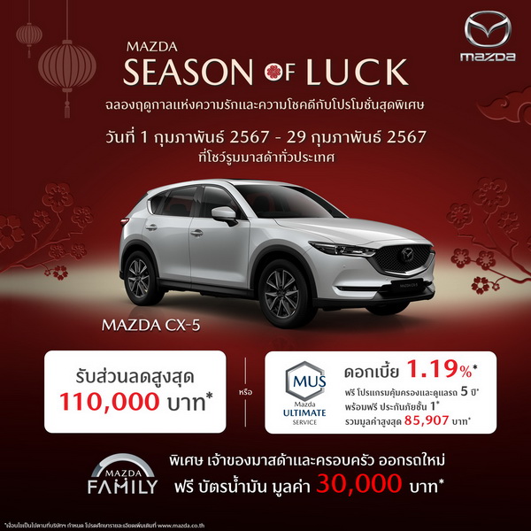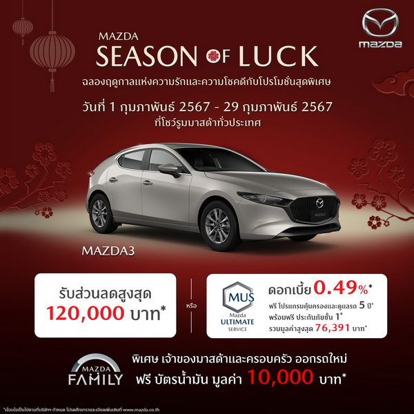 มาสด้าเดินหน้ากระตุ้นตลาดแบบเต็มสูบ โอกาสทองของลูกค้ามาถึงแล้ว ครั้งแรกและครั้งเดียวในรอบปี กับรถยนต์มาสด้าทุกรุ่นในราคาสุดพิเศษ สำหรับลูกค้าที่ต้องการเป็นเจ้าของรถยนต์นั่งสปอร์ตระดับพรีเมี่ยมที่สง่างามที่สุดในโลก เจ้าของรางวัลรถยนต์ออกแบบยอดเยี่ยมของโลก World Car Design of The Year อัดแน่นไปด้วยเทคโนโลยีสกายแอคทีฟ และระบบความปลอดภัยระดับโลก เมื่อมาสด้าร่วมฉลองฤดูกาลแห่งความรักและความโชคดีกับโปรโมชั่นพิเศษสุดครั้งเดียวในรอบปี SEASON OF LUCK มอบสิทธิพิเศษสำหรับลูกค้าที่ต้องการซื้อรถยนต์มาสด้าตลอดเดือนกุมภาพันธ์ รับส่วนลดสูงสุด 120,000 บาท* หรือ โปรแกรมคุ้มครองและดูแลรถ 5 ปี (MUS) พร้อมฟรีประกันภัยชั้น 1 รวมมูลค่าสูงสุด 100,861 บาท* และเมื่อจองซื้อรถยนต์มาสด้าทุกรุ่น รับฟรีลำโพง Sony Portable Wireless Speaker มูลค่า 1,990 บาท** พร้อมมอบสิทธิพิเศษให้กับเจ้าของรถยนต์มาสด้าและครอบครัวที่ออกรถใหม่ รับเพิ่มฟรีบัตรน้ำมันมูลค่าสูงสุด 30,000 บาท*** ลูกค้าที่สนใจพบข้อเสนอพิเศษนี้ได้ระหว่างวันที่ 1-29 กุมภาพันธ์ 2567 ที่โชว์รูมมาสด้าทั่วประเทศ