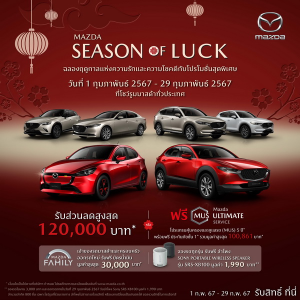 มาสด้าเดินหน้ากระตุ้นตลาดแบบเต็มสูบ โอกาสทองของลูกค้ามาถึงแล้ว ครั้งแรกและครั้งเดียวในรอบปี กับรถยนต์มาสด้าทุกรุ่นในราคาสุดพิเศษ สำหรับลูกค้าที่ต้องการเป็นเจ้าของรถยนต์นั่งสปอร์ตระดับพรีเมี่ยมที่สง่างามที่สุดในโลก เจ้าของรางวัลรถยนต์ออกแบบยอดเยี่ยมของโลก World Car Design of The Year อัดแน่นไปด้วยเทคโนโลยีสกายแอคทีฟ และระบบความปลอดภัยระดับโลก เมื่อมาสด้าร่วมฉลองฤดูกาลแห่งความรักและความโชคดีกับโปรโมชั่นพิเศษสุดครั้งเดียวในรอบปี SEASON OF LUCK มอบสิทธิพิเศษสำหรับลูกค้าที่ต้องการซื้อรถยนต์มาสด้าตลอดเดือนกุมภาพันธ์ รับส่วนลดสูงสุด 120,000 บาท* หรือ โปรแกรมคุ้มครองและดูแลรถ 5 ปี (MUS) พร้อมฟรีประกันภัยชั้น 1 รวมมูลค่าสูงสุด 100,861 บาท* และเมื่อจองซื้อรถยนต์มาสด้าทุกรุ่น รับฟรีลำโพง Sony Portable Wireless Speaker มูลค่า 1,990 บาท** พร้อมมอบสิทธิพิเศษให้กับเจ้าของรถยนต์มาสด้าและครอบครัวที่ออกรถใหม่ รับเพิ่มฟรีบัตรน้ำมันมูลค่าสูงสุด 30,000 บาท*** ลูกค้าที่สนใจพบข้อเสนอพิเศษนี้ได้ระหว่างวันที่ 1-29 กุมภาพันธ์ 2567 ที่โชว์รูมมาสด้าทั่วประเทศ