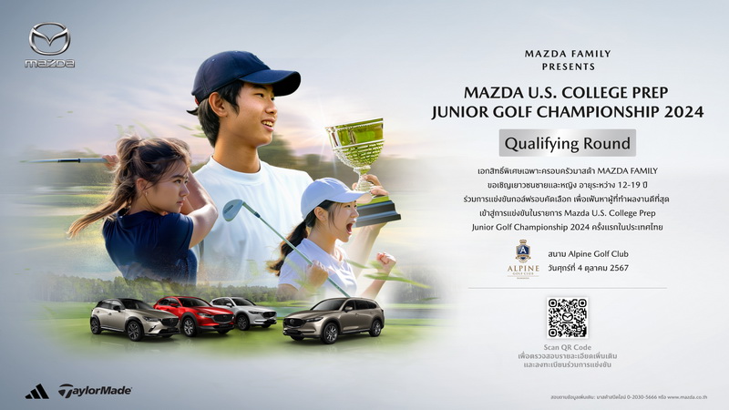 มาสด้าส่งเสริมเติมความฝันเยาวชนไทยสู่เส้นทางโปรกอล์ฟระดับโลก มอบโอกาสสุดเอ็กซ์คลูซีฟให้กับลูกค้าและครอบครัวผู้ใช้รถยนต์มาสด้า เพื่อคว้าสิทธิ์ในการเดินทางไปแข่งขันทัวร์นาเมนต์ใหญ่ในประเทศสหรัฐอเมริกา ประกาศเชิญชวนเยาวชนไทยทั้งชายและหญิงอายุระหว่าง 12-19 ปี สมัครเข้าร่วมการแข่งขันกอล์ฟรอบคัดเลือก ที่จัดขึ้นเพื่อเฟ้นหาผู้ที่ทำผลงานดีที่สุดเข้าสู่การแข่งขันรอบสุดท้ายร่วมกับนักกอล์ฟเยาวชนที่เดินทางมาจากทั่วโลก 128 คน ในโครงการ “MAZDA U.S. COLLEGE PREP JUNIOR GOLF CHAMPIONSHIP 2024” ซึ่งเป็นโครงการชั้นแนวหน้าระดับสากลที่เฟ้นหาและผลักดันเยาวชนกอล์ฟดาวเด่นให้ไปโลดแล่นบนเวทีระดับโลก ผู้ชนะเลิศจากการแข่งขันรอบสุดท้ายจะได้เดินทางไปร่วมการแข่งขันทัวร์นาเมนต์ใหญ่หลายรายการในประเทศสหรัฐอเมริกา รวมถึงเยาวชนที่มีความสามารถโดดเด่นก็มีโอกาสที่จะได้รับการเสนอทุนการศึกษาเพื่อปูทางก้าวสู่เส้นทางนักกอล์ฟมืออาชีพอีกด้วย นับเป็นโครงการดีๆ ที่เยาวชนไทยผู้รักในกีฬากอล์ฟไม่ควรพลาด