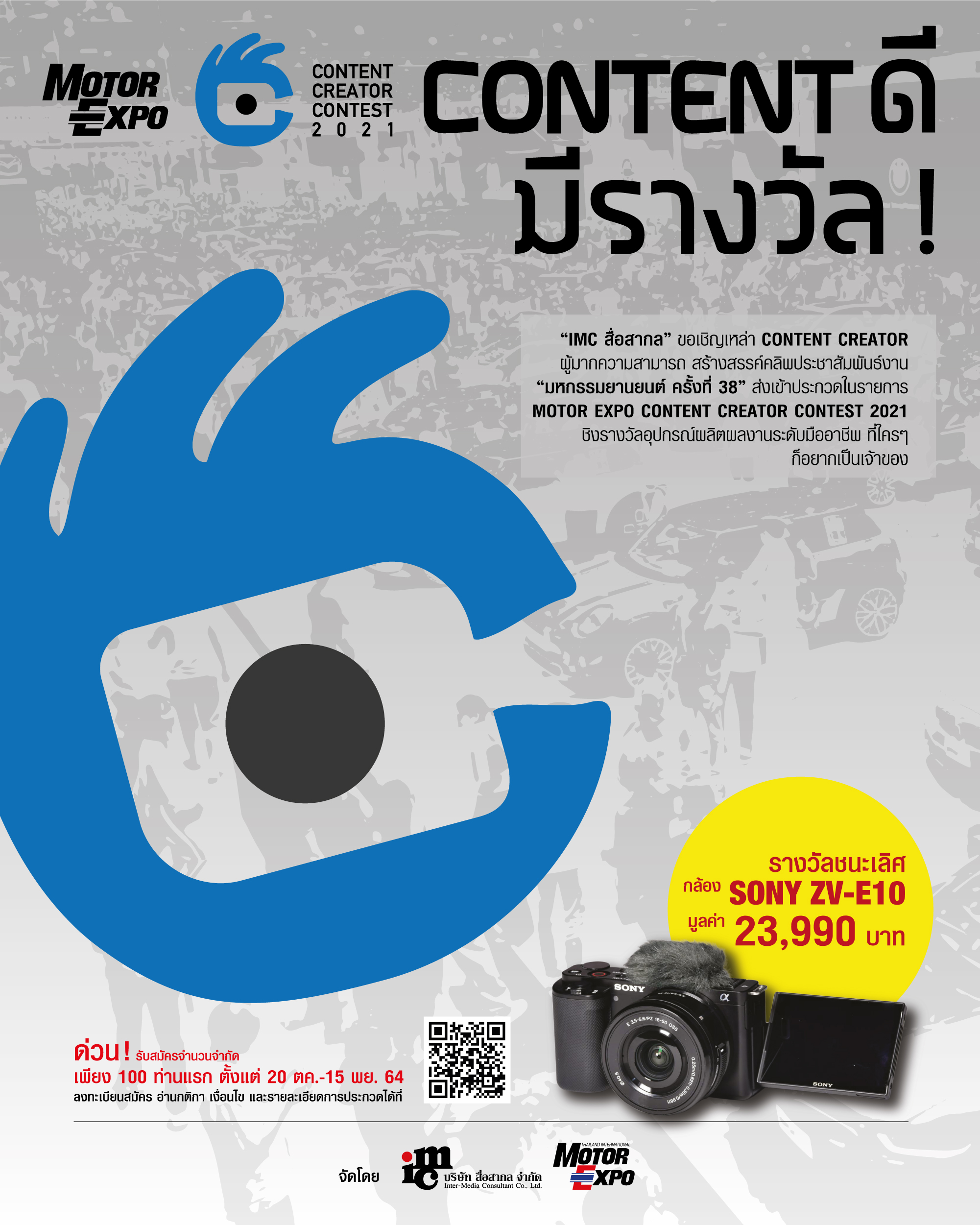 “IMC สื่อสากล” ผู้จัดงาน “มหกรรมยานยนต์” หรือ MOTOR EXPO ขอเชิญ CONTENT CREATOR ร่วมสร้างสรรค์ Video Clip เข้าร่วมโครงการประกวด “MOTOR EXPO CONTENT CREATOR CONTEST 2021” ชิงรางวัลรวมมูลค่ากว่า 45,000 บาท เปิดรับจำนวนจำกัด 100 ท่าน สมัครผ่าน QR Code ได้ตั้งแต่วันที่ 20 ตุลาคม–15 พฤศจิกายน 2564 ติดตามรายละเอียดการประกวดได้ที่ www.motorexpo.co.th/highlights/visitorspromotions/3847