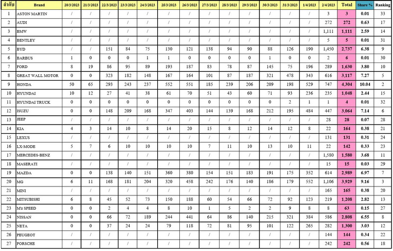 โดยแบ่งออกเป็นยอดจองรถยนต์อยู่ที่ 42,885 คัน เติบโตขึ้น 34.45% เมื่อเทียบจากปี 2565 ที่ผ่านมา โดยในจำนวนยอดจองล่าสุดของปีนี้ สามารถแยกประเภทออกมาเป็นรถยนต์ไฟฟ้า (Electric Vehicle หรือ EV) อยู่ที่ 9,234 คัน คิดเป็น 21.53% จากยอดจองรถยนต์ภายในงานครั้งนี้