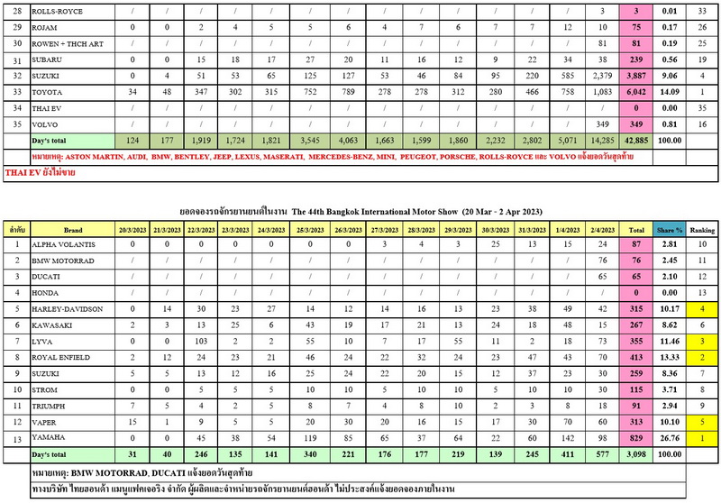 ขณะที่รถจักรยานยนต์มียอดจองในปีนี้ประมาณ 3,098 คัน เพิ่มขึ้นจากปีที่ผ่านมาอยู่ที่ 56.7% เป็นรถจักรยานยนต์ไฟฟ้าประมาณ 873 คัน (ทั้งนี้ บริษัท ไทยฮอนด้า จำกัด ผู้ผลิตและจำหน่ายรถจักรยานยนต์ฮอนด้า ไม่ประสงค์แจ้งยอดจองภายในงาน)
