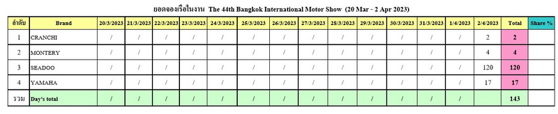 อีกทั้ง ภายในงาน บางกอก มอเตอร์โชว์ ครั้งนี้ นอกจากยอดจองของกลุ่มรถยนต์ที่มีการเติบโตอย่างสวยงามแล้วนั้น กระแสความนิยมในกลุ่มเรือและเจ็ทสกีกำลังขยายตัวเป็นอย่างมาก ส่งผลให้มียอดจองในกลุ่มเรือและเจ็ทสกีภายในงานประ มาณ 143 ลำ แบ่งออกเป็นยอดจองจาก Siamwatercraft ผู้จำหน่ายแบรนด์ Cranchi, Monterty, Seadoo มีจำนวน 126 คัน และ YAMAHA มียอดจองเจ็ทสกี อยู่ที่จำนวน 17 ลำ