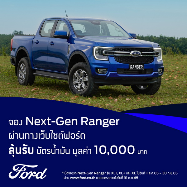 ฟอร์ดจัดแคมเปญสุดพิเศษ ‘จอง Next-Gen Ranger ผ่านทางเว็บไซต์ฟอร์ดลุ้นรับบัตรน้ำมัน 10,000 บาท’ สำหรับลูกค้าที่จองรถยนต์ ฟอร์ด เรนเจอร์ เจเนอเรชันใหม่ รุ่น XLT, XL+ และ XL ผ่านเว็บไซต์ฟอร์ดประเทศไทย www.ford.co.th ตั้งแต่วันที่ 1 สิงหาคม – 30 กันยายน 2565 และออกรถภายในวันที่ 31 ตุลาคม 2565 ที่โชว์รูมฟอร์ดทั่วประเทศ โดยลูกค้าที่จองตามเงื่อนไขจะมีสิทธิ์ลุ้นรับรางวัลบัตรน้ำมันมูลค่า 10,000 บาท จำนวน 50 รางวัล มูลค่ารวม 500,000 บาท